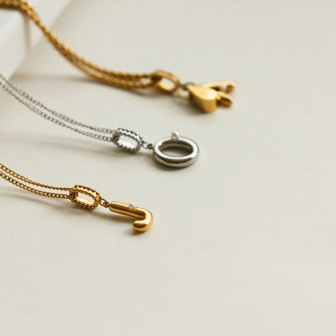 - Featuring a bubble initial, the piece is finished with a pearly bead and detailed chain loop