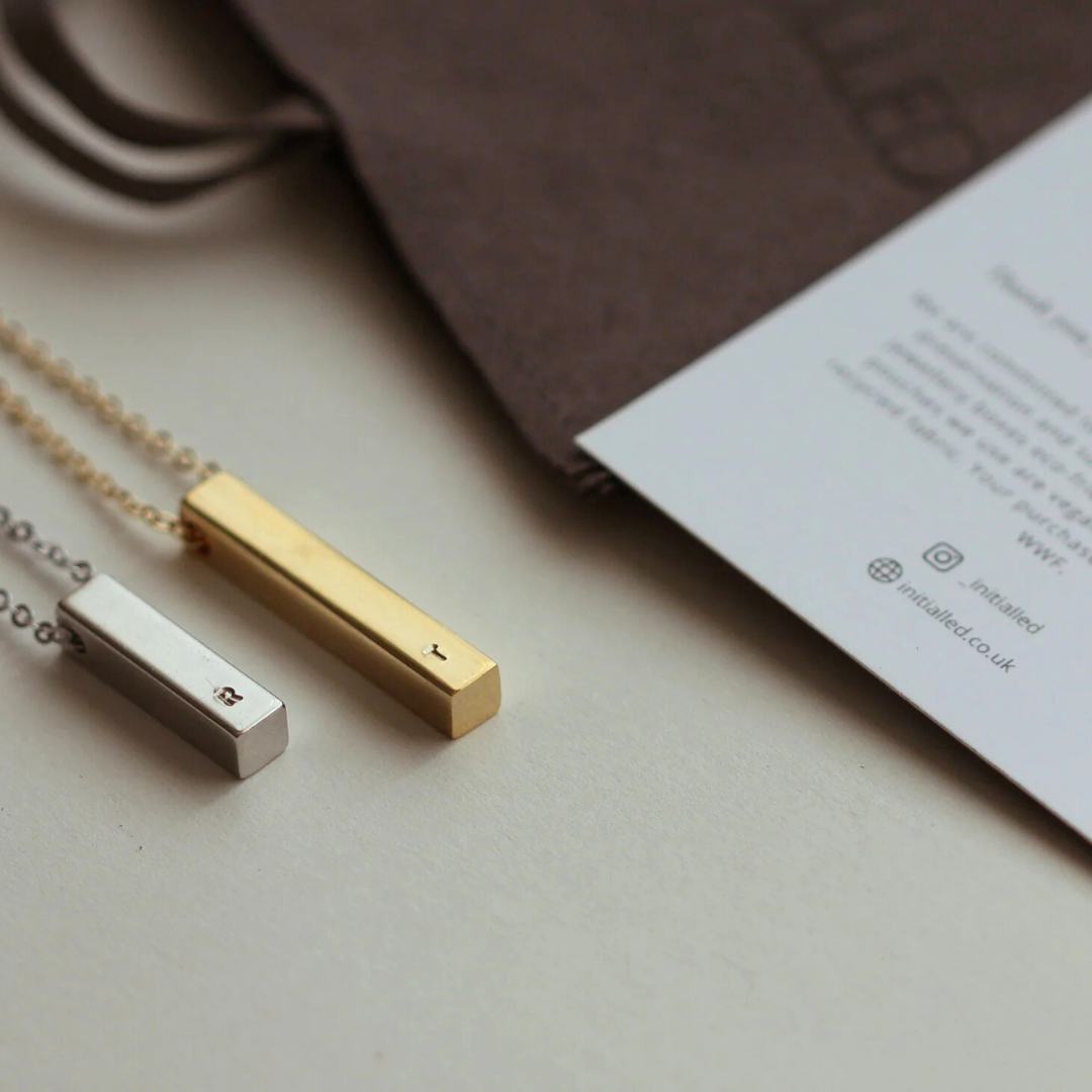 Our Waterproof 3cm CATERINA pendant is the perfect addition to your jewellery box. Available in Stainless steel and PVD coated (making it waterproof), choose from silver or gold and choose the amount of initials you'd like, whether that's 1 or 4. The initials will be placed 1 per side of the bar.